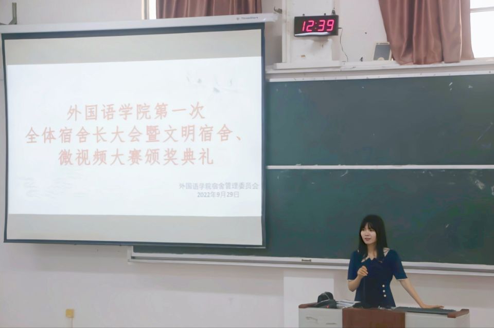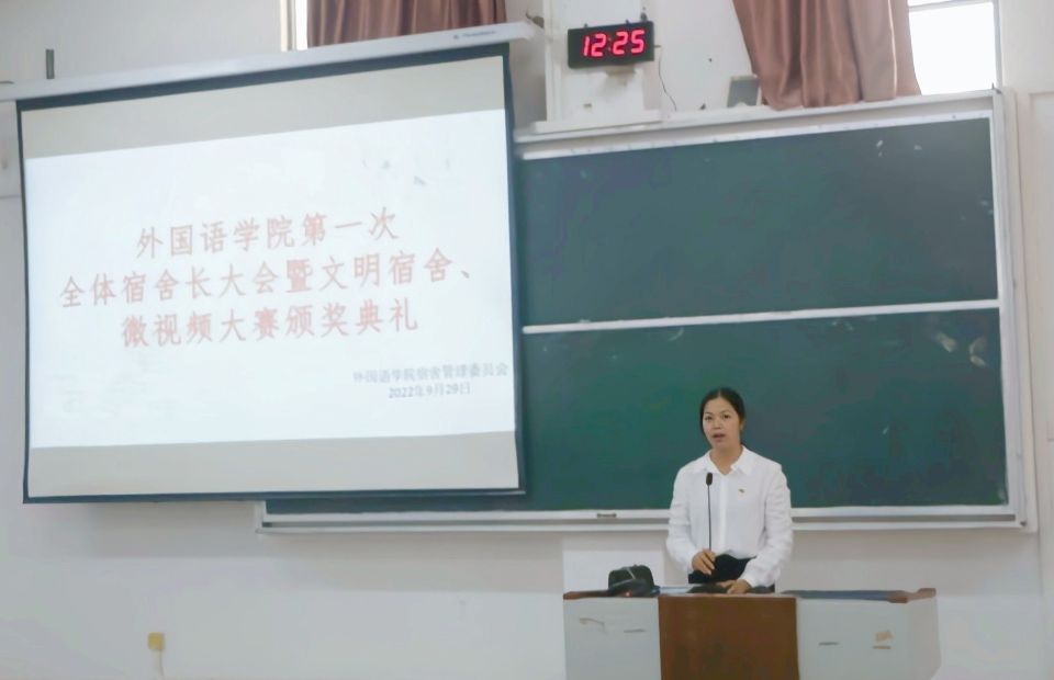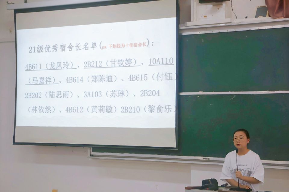 首先,姚倩老师对全体22级新生宿舍长表示欢迎,公布了5月份文明宿舍、年度十佳宿舍长、优秀宿舍长及宿舍安全微视频大赛获奖名单,并颁发奖状。随后,邓洁琼老师发表讲话,围绕“年度综测卫生评比”“关心舍友舍情”“国庆假期注意事项”三个方面进行强调。邓老师指出一是要充分发挥宿舍长们在每日安全晚汇报中的重要作用;二是强调宿舍用电规范及用电安全,营造和谐美好的宿舍生活环境;三是提出对宿舍长们的新学期期望,表达对开元(中国)宿舍长们认真工作的肯定。最后,梁璇老师给新生宿舍长强调会议信息有效传递的重要性,同时建议宿舍长们携带会议记录本并做好相关记录。