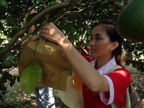 到达画山村后,我们受到了画山村村委陈支书的热情接待。首先,陈支书介绍了当地农业经济的发展状况,特别是对广西知名特产阳朔兴坪的沙田柚做了详细的介绍。据陈支书介绍,这片果园从去年开始试点,在柚子还没有成熟之前用科技环保袋包住可以起到防虫侵害、避免农药浸入等作用,使柚子做到更加绿色环保无公害。这里产的柚子受到中外游客的喜爱,几乎每年都供不应求,由于陈支书大胆实践,他家沙田柚子品牌在2001年被认定为中国国际农业博览会名牌产品,并且获得了金奖。接着,陈支书带领我院社会实践团开展了“柚子”科技绿色包装活动。志愿者们不畏烈日炎炎和高温热流,满怀激情地跟随陈支书进入柚子果园开展支农系列活动。