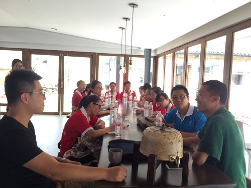 13日上午志愿者们顶着烈日来到位于兴坪镇杨家村的“云庐酒店”,与酒店负责人许先生以及酒店管理主任一同对中外文化交流对兴坪经济的影响开展交流活动。兴坪“云庐酒店”是一家主要以外国游客为主的中外文化结合的特色酒店。志愿者们围绕中外文化交流这一主题开展昨天,从酒店两位管理者中了解了很多这方面的情况和数据。