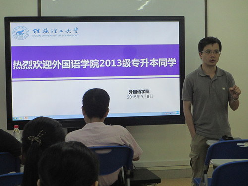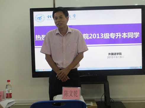 2015年9月8日下午,我院在04206教室召开2013级专升本同学的欢迎会。我院党委书记陈文乾、院长全克林、党委副书记江玲、副院长唐渠、副院长胡金、副院长陈湘柳、日语教研室主任张军、英语教研室副主任亢江瑶出席本次会议,2013级辅导员王威主持会议。