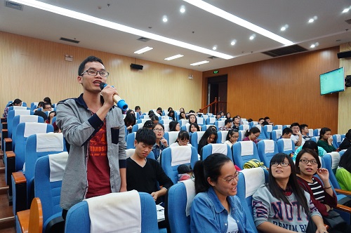 曾庆斌老师用幽默风趣的开场白拉进了与同学们之间的距离,活跃了现场气氛。他首先向大家介绍了中外文化差异以及翻译行业的现状。他指出我国翻译市场正在成长,翻译行业前途光明。随后,曾庆斌老师向同学们详细介绍了翻译项目的流程,并指出“品德兼优,德才兼备”是职业翻译工作者应有的重要素质。曾庆斌老师还与大家分享了他十年磨一剑的艰苦创业故事,并耐心认真地解答了同学们提出的各种疑问。