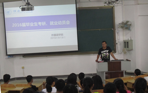 2015年9月8日下午,我院2016届毕业生考研、就业动员会在05101召开。我院党委副书江玲、副院长胡金、英语教研室副主任亢江瑶以及2014级辅导员赵思聪出席本次动员会,全体2012级学生参加此次会议。