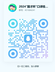 同时,参赛选手须加入:2024“国才杯”口译桂工校赛QQ群:451684241(二维码如下)完成校内报名,比赛相关具体信息通过该QQ群发布。
