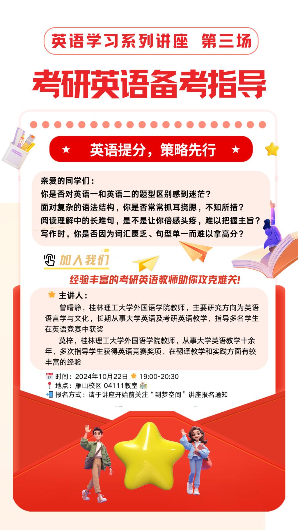 为进一步提升我校学生英语应用能力,英语学习系列讲座第三场即将举行,讲座详细信息见海报: