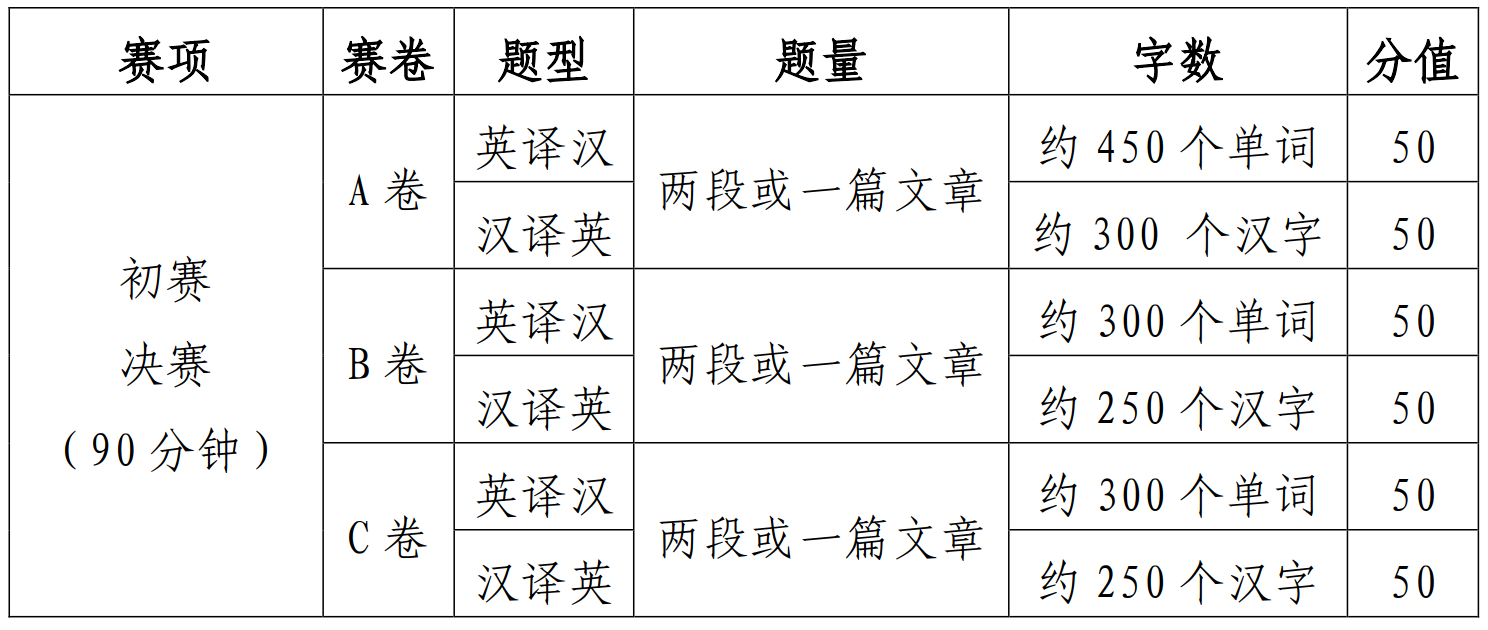 初赛和决赛均采取纸质赛卷笔试形式,题型为英汉互译(英语语种)。