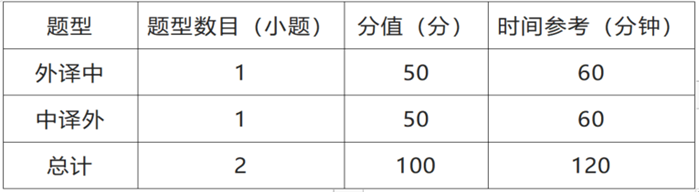 满分为100分,时间为120分钟,共2种题型2道题,全部为主观题。参赛选手可使用中译外、外译中纸质版词典各1本。
