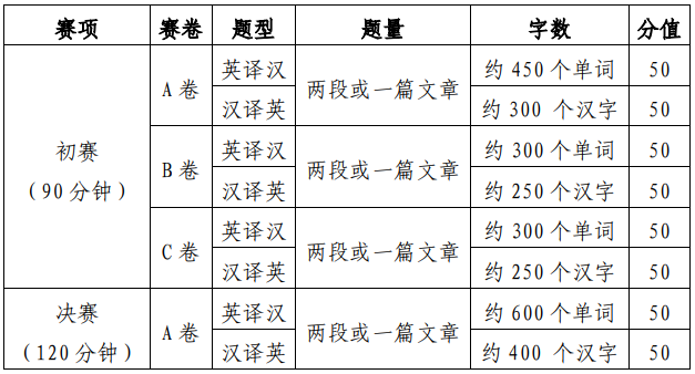 初赛和决赛均采取纸质赛卷笔试形式,题型为英汉互译。