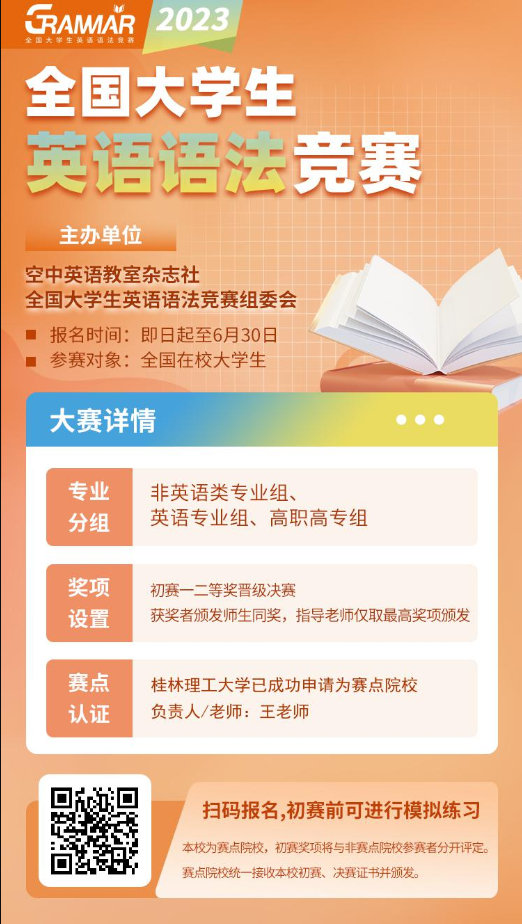 为贯彻落实教育部《开元网页版登录入口加快建设高水平本科教育全面提高人才培养能力的意见》等文件精神,激发大学生学习英语的兴趣,增加英语语法知识的储备量,促进学生英语能力发展,为全国在校大学生提供展示英语语法水平和能力运用的舞台,特举办2023年全国大学生英语语法竞赛(以下简称“竞赛”)。桂林理工大学为赛点院校,现将大赛相关事宜通知如下: