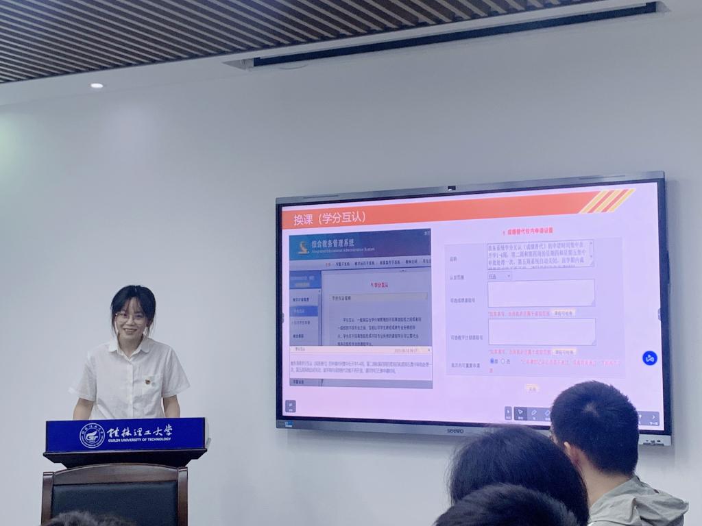首先,三位转专业优秀学生代表依次分享。第一位分享的是陈小云,她就如何平衡学习和工作进行阐述,面对大二繁重的学习任务,建议新生要学会调节情绪、合理规划、落实行动。接着,蒙何欣同学从选课换课、学分置换等方面给新生提出建议。第三位分享的是周云鹏同学,他给新生们分享了大学英语及英语专业四级的备考技巧以及实用软件。接着,开元(中国)党委副书记邓洁琼老师作总结发言。邓老师强调,同学们要权衡学习与学生工作,积极参加学生活动,不断提高自己的综合能力,也祝愿转专业同学在外院能够通过自己的努力,遇见更加优秀的自己。最后,2022级辅导员梁璇老师补充发言。梁老师提醒同学们要不忘“转专业初心”,努力学习,全面提升自己,同时向同学们强调了会议纪律及宿舍卫生安全注意事项。
