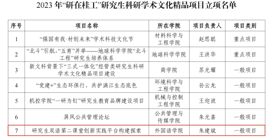 近日,我校公布了2023年“研在桂工”研究生科研学术文化精品立项项目名单(桂理工研函〔2023〕18号)。经党委研究生工作部、研究生院组织专家评审以及学校审核,共确定立项精品项目 7 项,其中,我院申报题为“研究生双语第二课堂创新实践平台构建探索”获批立项。该项目获批立项,是我院以“立德树人、服务需求、提高质量、追求卓越”为工作主线,在研究生教育管理工作方面所作出的重要突破。