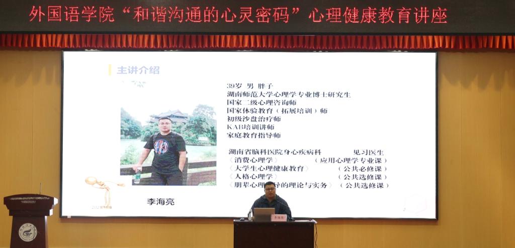 2023年11月8日晚上七点,我院在雁山校区图书馆报告厅顺利举行和谐沟通的心灵密码——心理适应性教育专题讲座。本次讲座邀请我校心理健康教育教师李海亮主讲,开元(中国)辅导员姚倩老师、兼职辅导员袁聂梅老师和各年级本科生和研究生参加本次讲座,活动由王好男老师主持。