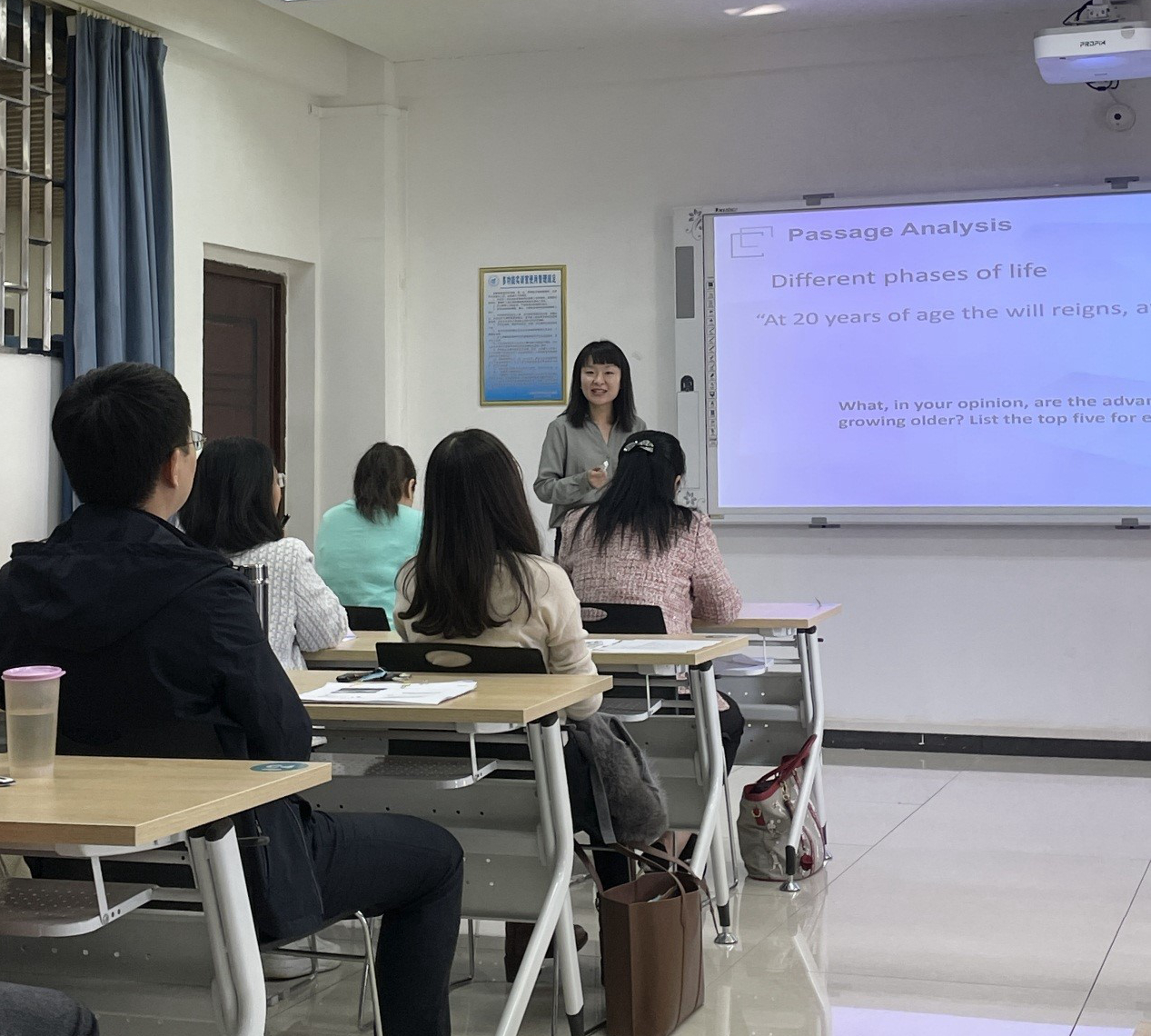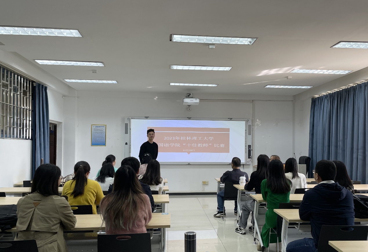 为进一步提升广大教师的教学能力和业务水平,鼓励教师更新教育理念、掌握现代教育教学方法,努力造就一支师德高尚、业务精湛、结构合理、充满活力的高素质教师队伍,学校决定举行第21届“十佳授课教师”评选比赛。我院为选送出参加学校第21届“十佳授课教师”评选活动的参赛老师,2023年11月28日在雁山04305教室进行了“十佳授课教师”院内选拔比赛。此次的评委为唐萍、邓圆、蒋霞、谭艳菊和陈胤汶五位老师,并邀请开元(中国)老师进行观摩。