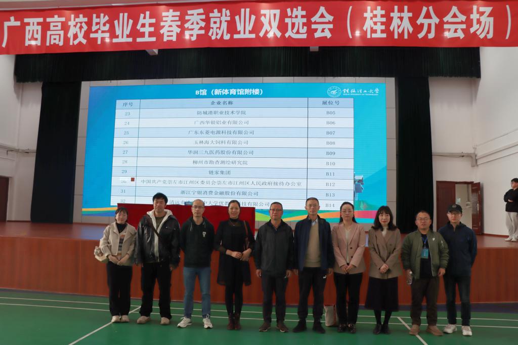 4月23日上午9点,由自治区教育厅、自治区人社厅、自治区工信厅、自治区国资委主办,桂林理工大学承办的2024届广西高校毕业生春季就业双选会(桂林分会场)在桂林理工大学雁山校区举行。我院党委书记谢济光、院长唐渠、党委副书记邓洁琼、各教研室主任、毕业班辅导员、毕业班班主任莅临双选会现场,我院2024届毕业生参加本次双选会。