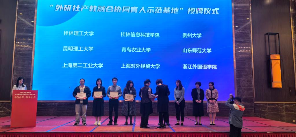 外研社入选教育部第三期供需对接就业育人项目,获批“就业实习基地项目”,以促进教育资源与产业资源联动,持续赋能院校人才培养。本次会议上举行了“外研社产教融合协同育人示范基地”授牌仪式,与入选教育部第三期供需对接就业育人项目的桂林理工大学等9所全国院校开展全面、深入的产教融合创新实践,助力培养实战型外语人才。
