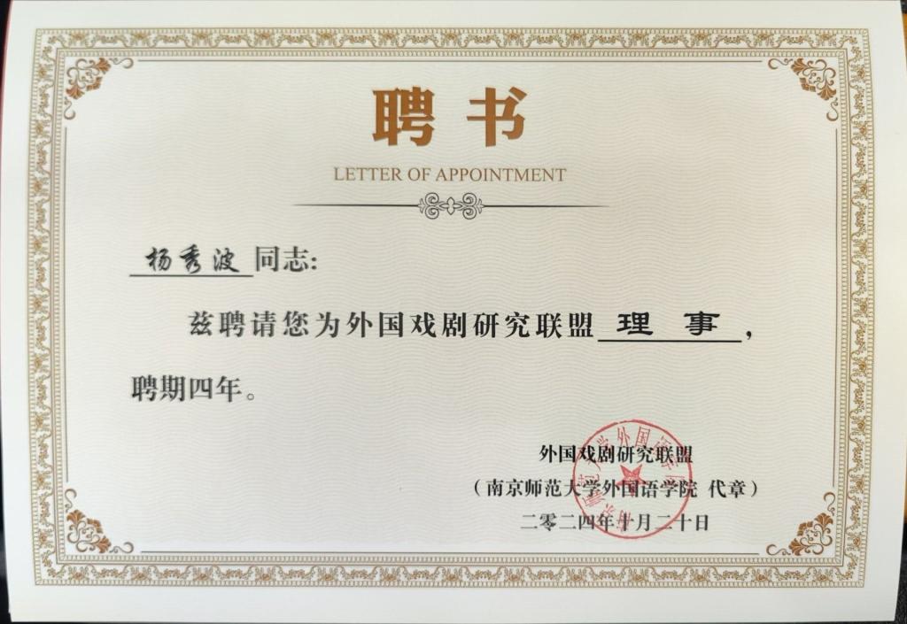 在南京由外国戏剧研究联盟主办(会议时间:10月19日-20日),外语教学与研究出版社、上海外语教育出版社协办的外国戏剧研究联盟第一届专题研讨会上,我院副教授杨秀波被邀请参加这次会议,并在会上做了"重新解读哈姆雷特"的主题报告。在会议上,杨秀波副教授被聘为外国戏剧联盟理事,这是杨秀波老师继成为中国外国文学学会莎士比亚研究分会理事之后又一次获得国家级学术组织理事职位。