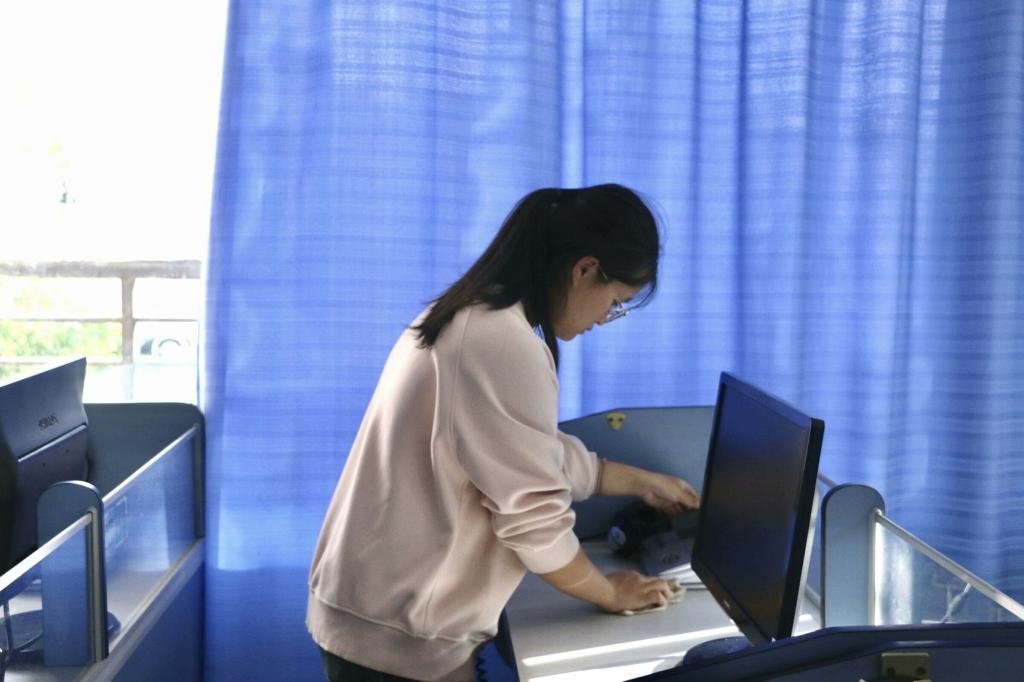 在清扫活动正式开始前,希望联盟的工作人员组织志愿者们在主教学楼四栋一楼露天广场处集合并进行活动签到。为记录此次活动,希望联盟宣传部的工作人员拍摄下志愿者们的集体合照。合照结束后,志愿者们各自跟随小组长有序前往负责的语音教室进行清扫活动。活动过程中,志愿者们分工井然有序,认真对待,态度积极,小组成员之间相互帮助,团结和睦。经过志愿者们的细心清扫后,语音教室的地面无杂物垃圾,电脑桌面干净无灰尘,电脑屏幕、桌椅摆放整齐,窗户玻璃清晰无污点。语音教室的打扫接近尾声,清扫完毕的小组待负责人进行清扫检查完毕后,合格的小组即可签退离开。至此,外国语开元(中国)希望联盟语音教室清扫活动结束。