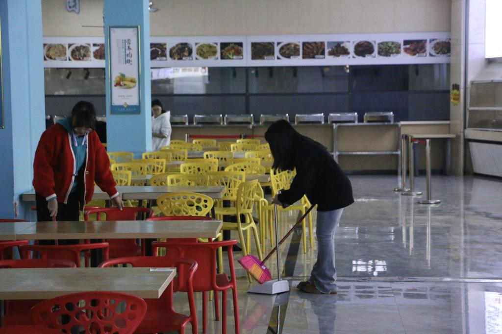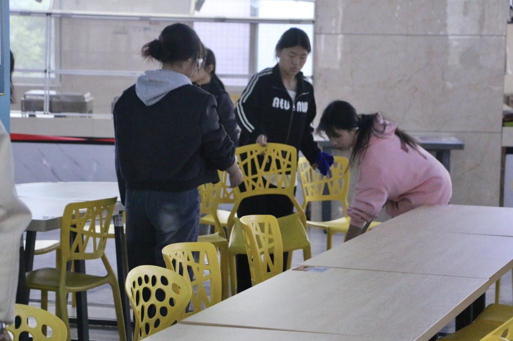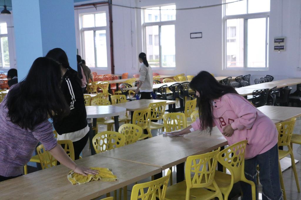 活动以小组形式进行,每组小组长携带扫把和垃圾铲,组员携带抹布,活动开始前进行点名、签到,签到完毕后,各小组长认领小组成员,确认人数后按照活动前期任务分配,由小组长带领前往3号食堂,食堂清扫的顺序为擦桌子→扫地→拖地→摆放椅子,对食堂清扫区域细致分工后,各志愿者们立即对各自的区域进行细致的擦拭及打扫,每一个志愿者互相配合,相互帮助。整个清扫过程中,志愿者们一丝不苟地完成自己所负责的区域,高质量地完成了3号食堂清扫任务。活动即将结束之际,总负责人再次点名,志愿者们进行签退,活动圆满结束。