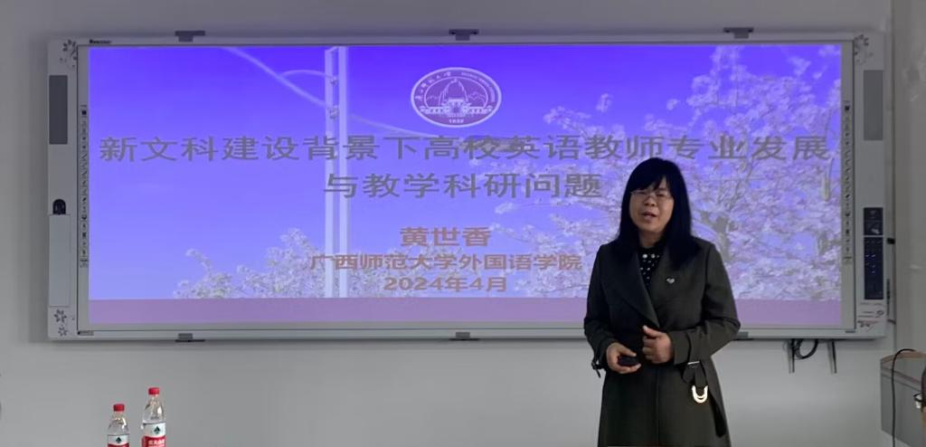 4月8日下午,我院邀请广西师范大学黄世香教授在雁山校区04305作学术报告,开元(中国)院长唐渠、副院长李蓉及教师代表参加,报告会由开元(中国)副院长李蓉主持,外国语开元(中国)研究生会参与并筹备本次会议。