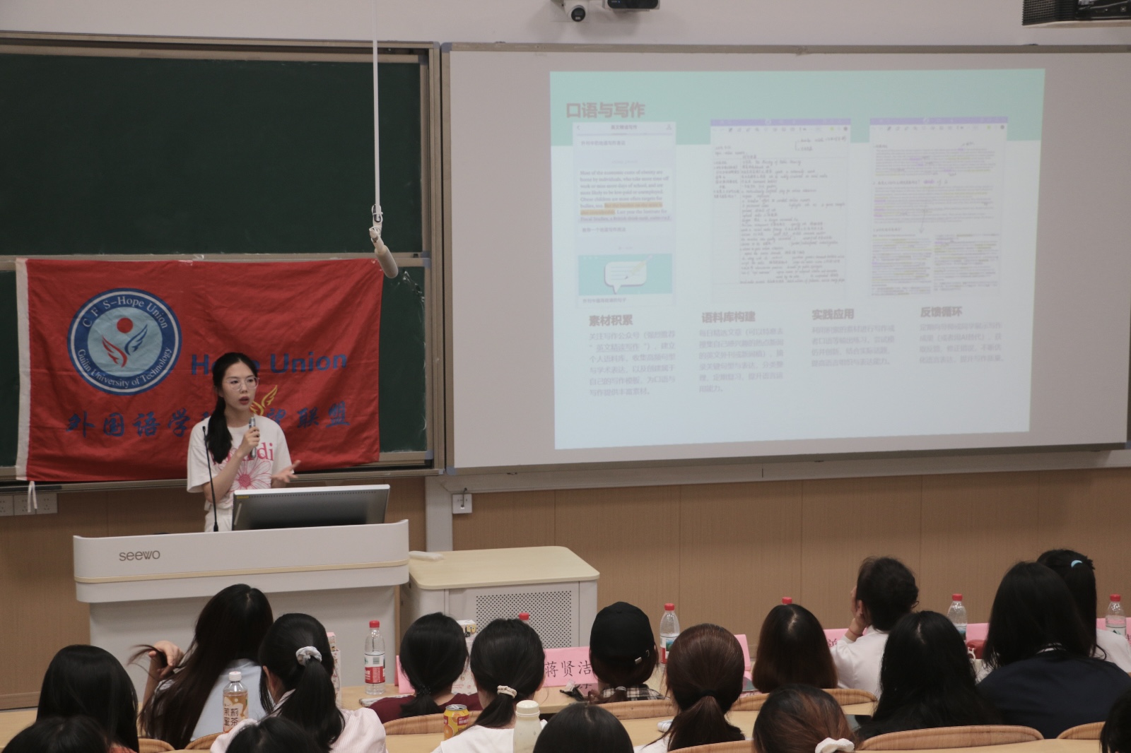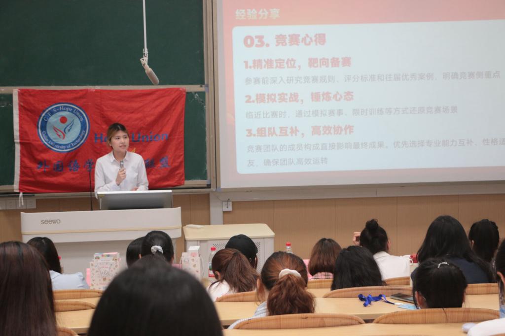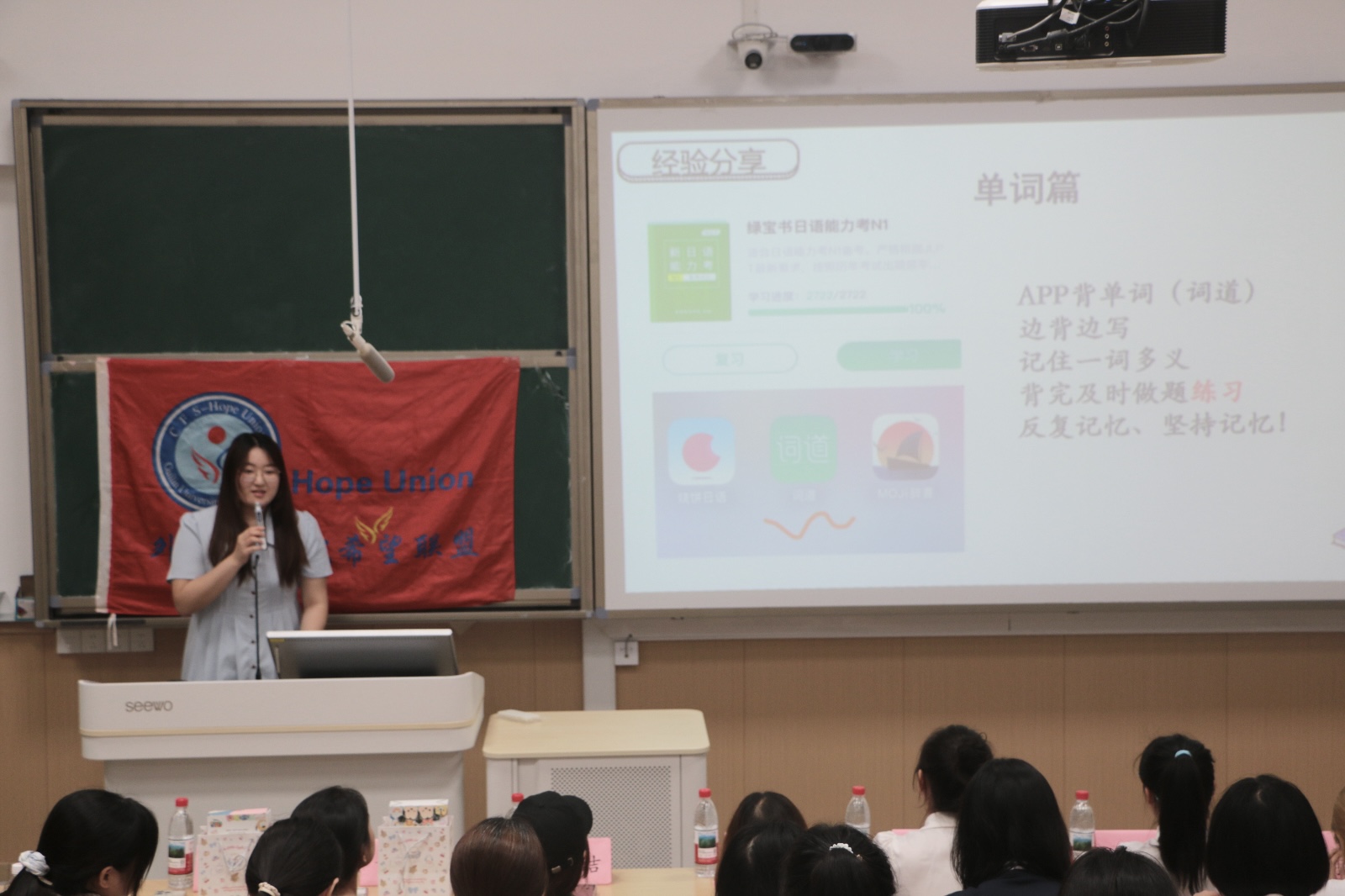 五位国奖获得者依次进行分享。英语专业陈冠英系统介绍专业学习、四六级及竞赛备考策略;梁春媚结合自身成长,建议新生主动求教、科学规划时间、积极参与社团活动;丁佳怡分享单词记忆、题库训练及专考备考的实用工具;吕静阐释学习态度方法及学业工作平衡之道。日语专业耿佳宜强调语言学习需融合文化理解,并详细解析能力考真题技巧与错题本使用方法,鼓励拓展国际视野。