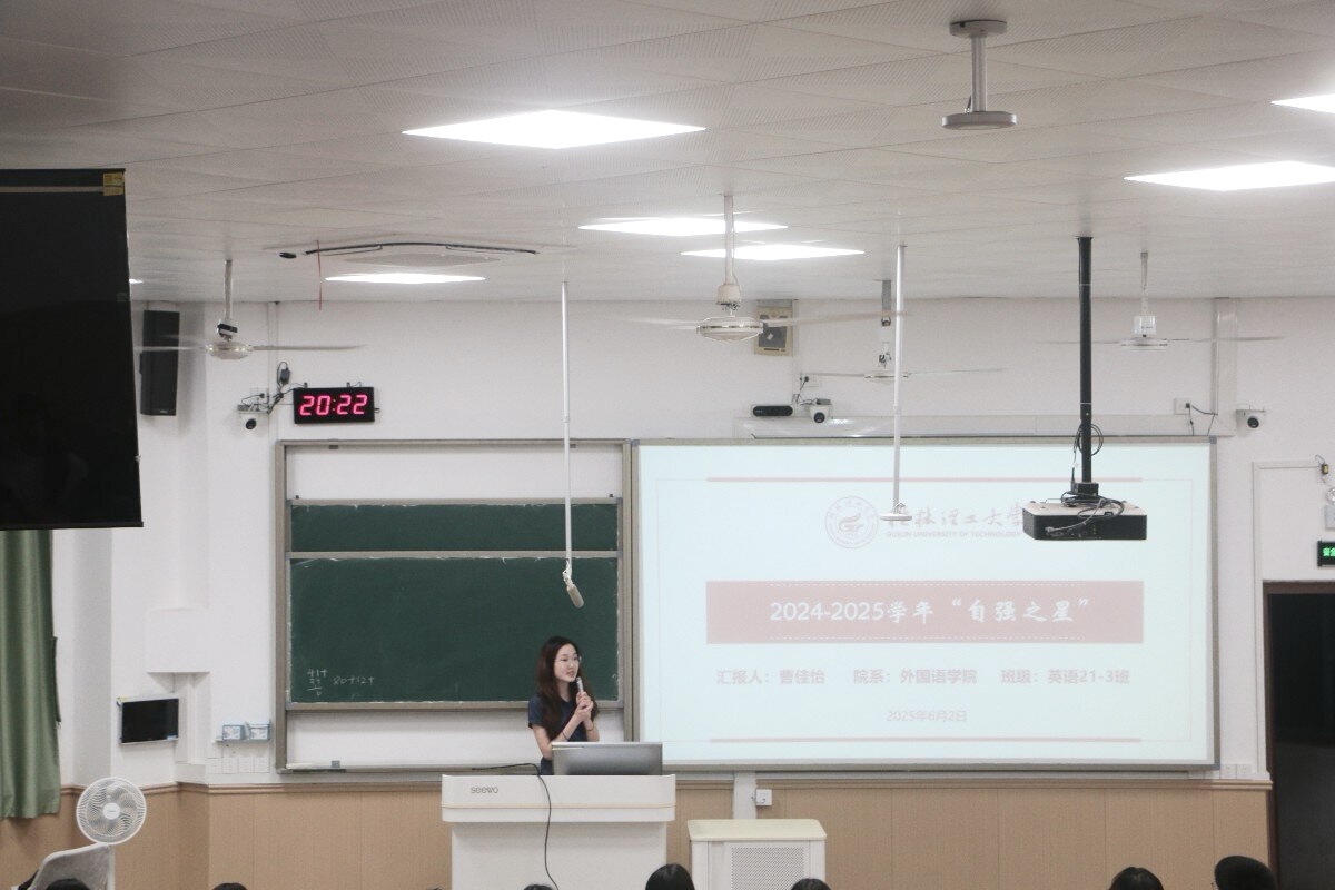本年度“自强之星”获得者曹佳怡同学担任主讲。陈欣老师首先介绍了曹佳怡同学的优秀事迹。随后,曹佳怡以“奋发进取——探索各种可能性”为主题,结合自身经历进行分享。报告中,曹佳怡不仅分享了高效的外语学习方法和实用资源(如新闻报道、口语练习、演讲辩论平台),还向学弟学妹们推荐了值得参与的竞赛活动,并详细介绍了备赛经验。她着重传递了“不断尝试”、“勤勉不懈”、“自强自立”的核心精神,鼓励大家勇于探索,追求卓越。