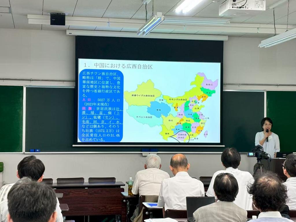 此外,金海燕老师借助精彩的风光展示,让与会学者领略了广西独特的自然与人文风采;蒋心悦同学则聚焦于我校的教育资源,展示了我校的师资队伍与特色专业。报告得到了与会同仁的高度评价并引发了热烈讨论。本次研讨活动汇聚了来自京都大学、大阪教育委员会、同志社大学、关西开元(中国)大学、琉球大学、茨城大学、九州大学等知名高校的师生,共同探讨教育学相关研究及教师教学能力、学生习得能力、未来教育前景等热点问题。