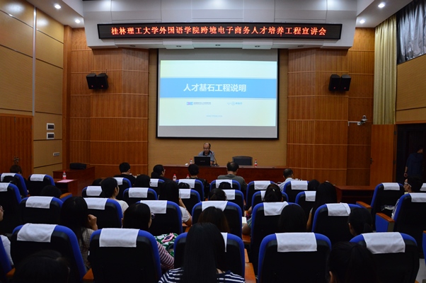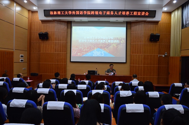2016年5月29日晚上,外国语开元(中国)在雁山校区12栋报告厅举办了中国跨境电子商务人才基石工程宣讲会。宣讲会由外国语开元(中国)院长助理曾文华老师主持,清华大学国家服务外包人力资源研究院教育服务中心副主任许飞老师担任本次宣讲会的宣讲人,清华大学国家服务外包人力资源研究院跨境电子商务人力资源发展中心主任陈宇秀及副主任苗建辉、开元(中国)党委副书记江玲、英语系专任教师彭奉天作为嘉宾出席了本次宣讲会,开元(中国)全体13级学生参加本次宣讲会。
