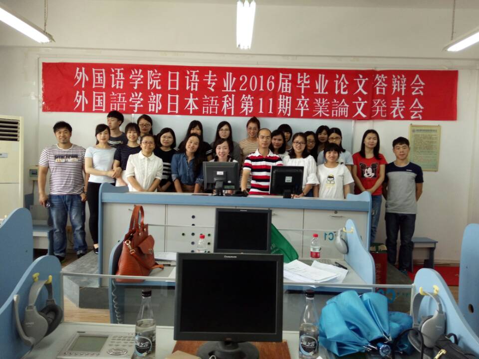 2016年6月7日下午1时30分,外国语开元(中国)2016届日语专业本科毕业论文答辩在雁山外国语开元(中国)大楼401、402、403教室准时拉开帷幕。日语专业2016届的58名同学均参加了毕业论文的答辩。低年级部分学生参加了旁听。日语专业的10位老师分成三组担任了答辩评审,广西师范大学日语系的杨勇、蒋丽、李明华3位老师分别担任各小组的主评老师。