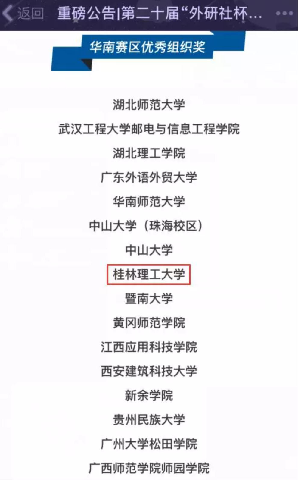 我院规范组织校园选拔赛,认真选拔参赛团队。在第二十届全国“外研社杯”英语辩论赛我校荣获优秀组织奖。本次比赛华南赛区共有96所高校参赛,我校是广西区两所获奖高校之一,是桂林唯一一所获得该项荣誉的高校。