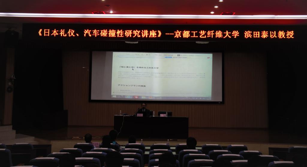 为加深学生对日本文化的了解,提高学生们学习日语的兴趣,2017年4月5日晚上,由我院开展的日本礼仪、汽车碰撞性研究讲座在雁山校区图书馆报告厅顺利举行。此次讲座邀请到京都工艺纤维大学的滨田泰以教授做主讲,并邀请了东华大学纺织开元(中国)工学博士副教授阳玉球、开元(中国)团委书记钟立军、日语教研室主任曾文华做嘉宾,开元(中国)全体日语专业的同学们参加此次讲座。