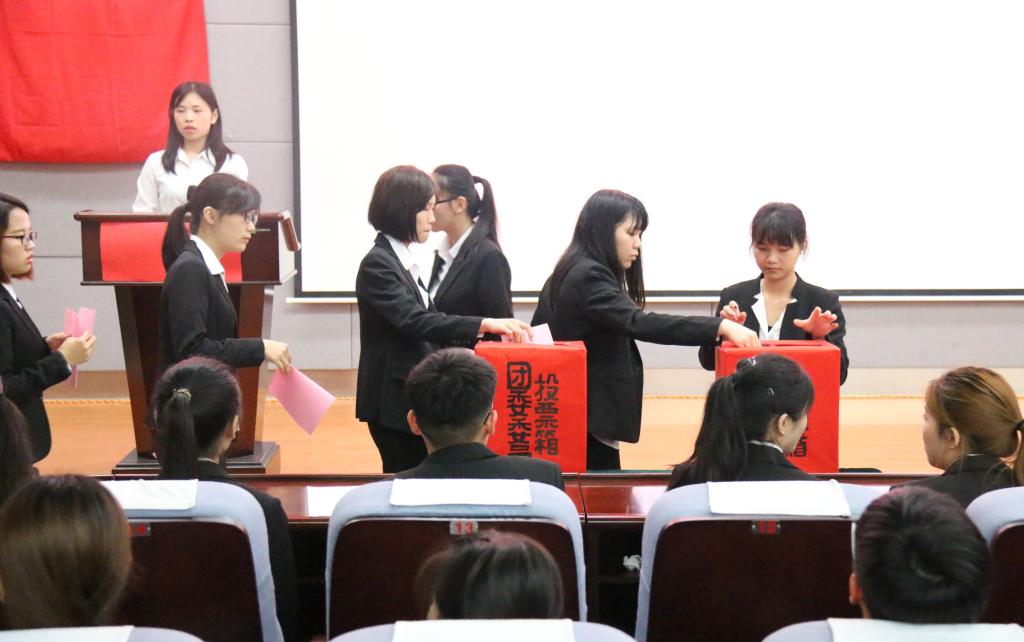 在选举会议中,大会采取投票选举的方式,代表们审议并通过了大会选举方法以及监票人和计票人名单。各位代表在认真倾听第三届团委委员、学生会委员候选人们简况后,为他们投下了宝贵的一票,在经过工作人员的精心统计后,主持人公布了新一届团委委员和学生会委员名单,代表们也认真填写提案表,写下对开元(中国)的意见和建议。最后,由我院团委书记钟立军致闭幕词,并在悠扬的团歌中,第三次团员、学生代表大会圆满落幕。