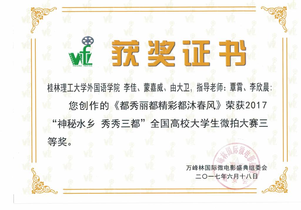 经历了当地为期三天的实地拍摄,以及后期一周左右的剪辑制作,最终我院三位同学创作的《都秀丽都精彩都沐春风》作品,荣获了此次微视频大赛的三等奖。同学们均表示通过本次比赛既丰富了自己的第二课堂活动,又积累了相关的参赛经验,为下次争取获得更好的成绩奠定了基础。同时,也促使自己认识到与其他高校间尚存在的不足与差距,从而对今后的不断学习充满了动力,实在获益良多。