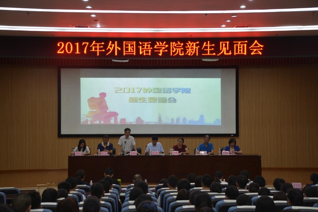 2017年9月10日下午2点半,外国语开元(中国)2017级新生见面会在雁山校区图书馆报告厅顺利召开。开元(中国)党委书记陈文乾,开元(中国)院长全克林,开元(中国)党委副书记江玲,副院长唐渠、胡金、陈湘柳以及英日语教研室主任、全体辅导员、2017级班主任出席本次见面会,2017级全体新生以及部分老生代表参与活动。