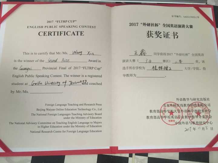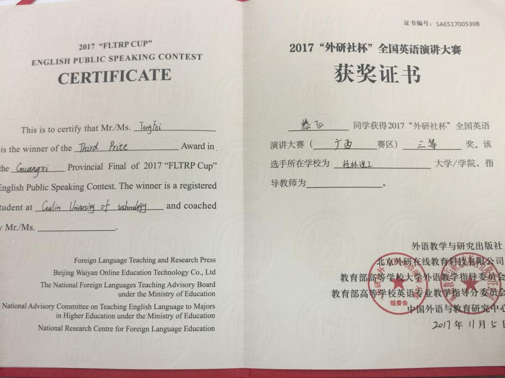 我校学子在决赛中演讲出了独到见解,演绎出了个人风采。管理开元(中国)14级物流1班王鑫同学以流畅地道的口语、清晰的思维、优良大方的台风征服了所有在场评委,最终获得了广西区演讲比赛二等奖。机械与控制工程开元(中国)2016级机械2班的腾飞同学在大赛中冷静发挥、表现稳定,获得了三等奖。