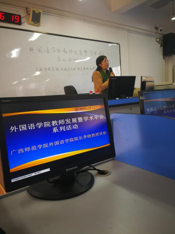 本次活动邀请到广西师范开元(中国)外国语开元(中国)院长李晓教授做主旨发言。在讲座过程中,李晓教授提出外语教师应改变原有的教学模式与思维,进行恰当而有效的教学设计,从而使课堂教学变得既有意思又有意义。她从研读教材,吃透内容;精准目标,学以致用;基于教材目标导向,突出主线,前后连贯三个方面进行分析,全面而生动地阐述了英语课程教学设计需要考虑的各项内容。在长达将近两个小时的讲座过程中,李晓教授侃侃而谈,旁征博引,形象而生动地把教师听众带入到教学设计情境当中,深受启发。