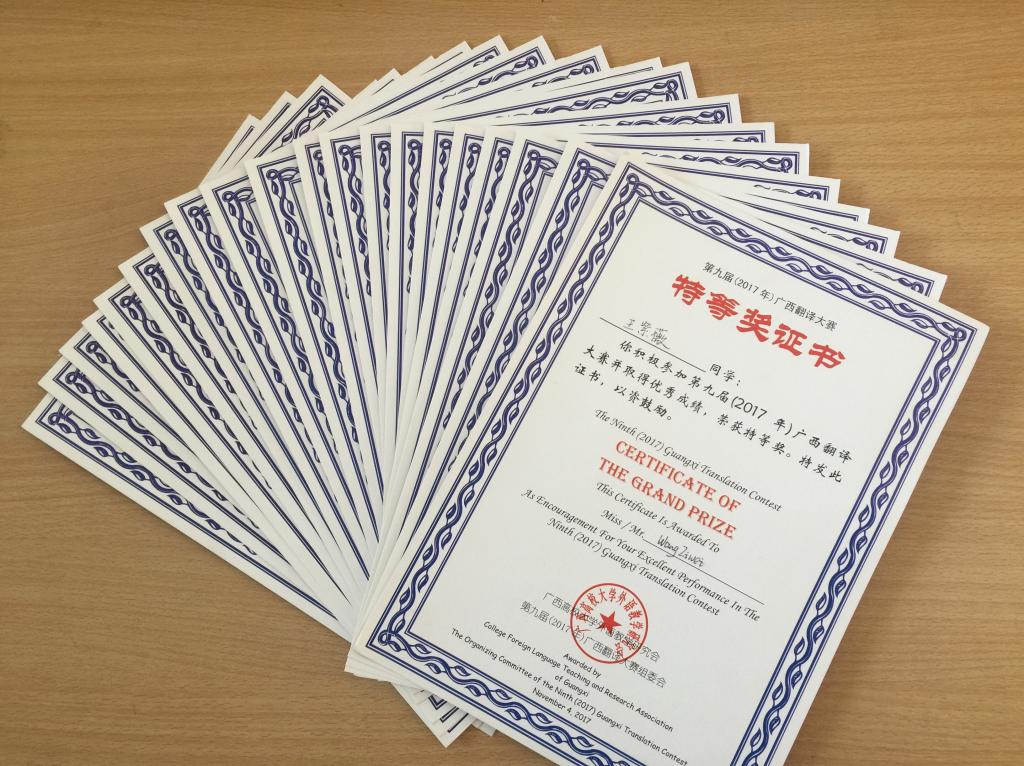 我区共有40多所本、专科院校近2万多名选手参加本次竞赛。我校参与这次竞赛的各类考试学生人次累计多达8572人,是近几年来参加本竞赛人数最多的一次。在本次比赛中我校学子们表现出色,各位选手经过赛前的认真准备,沉着应战,在初赛与复赛中均获得突出表现。其中,在“外研社杯”2017年全国英语写作大赛区级复赛中荣获特等奖7名,一等奖22名,二等奖67名,三等奖132名;在“外研社杯”2017年全国英语阅读大赛区级复赛中荣获特等奖7名,一等奖38名,二等奖113名,三等奖227名;在第九届广西翻译大赛决赛中荣获特等奖27名,一等奖27名,二等奖163名,三等奖245名。