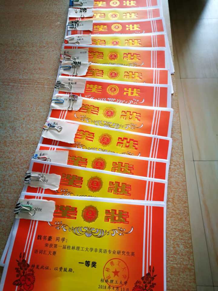 为丰富学生的课余生活,给学生提供一个展现自我、提升自我的机会和舞台,提高学习英语的积极性,以“我爱记单词”为主题的第一届桂林理工大学非英语专业研究生英语词汇大赛于2018年4月拉开帷幕。2017级非英语专业全体研究生经过初赛选拔,有250名同学进入决赛,最后有22名同学获得一等奖,54名同学获得二等奖,70名同学获得三等奖。本次英语单词大赛参赛面广,达到了促进研究生记忆英语单词,提高英语词汇量的目的。