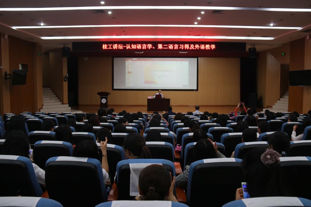 4月27日下午,广西民族大学覃修桂教授应邀做客桂工讲坛,在我校雁山校区图书馆报告厅带来了一场主题为“认知语言学、第二语言习得及外语教学”的精彩讲座。我院院长全克林教授、相关专业教师和研究生参加了此次讲座。
