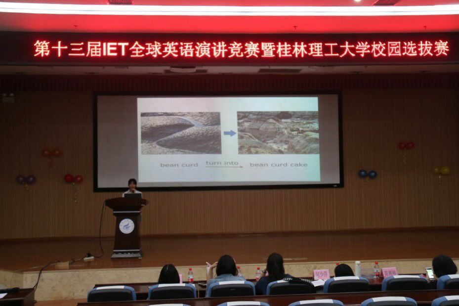 4月28日下午,我校举办的第十三届IET全球英语演讲竞赛暨桂林理工大学校园选拔赛在雁山图书馆报告厅落下帷幕。外国语开元(中国)副院长陈湘柳教授出席了本次比赛,大学英语教研室曾湘宁、张丽维、邢芸、何少萍四位老师担任本次大赛评委。我校学生积极报名,热情参与,最终来自各个专业的19名选手进入选拔赛。