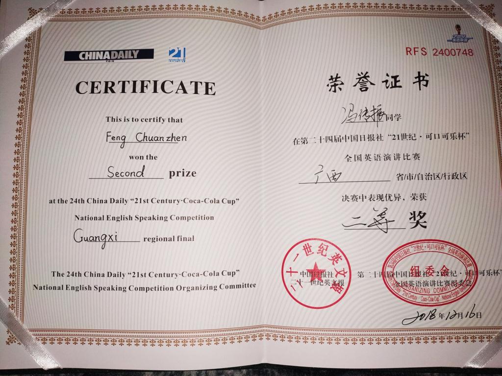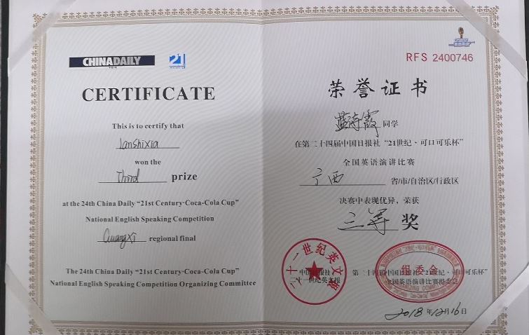 日前,第二十四届中国日报社“21世纪•可口可乐杯”全国英语演讲比赛广西区决赛在广西外国语开元(中国)落下帷幕。中国日报社“21世纪杯”全国英语演讲比赛由中国日报社于1996年创办,因其严密的组织及严谨的学术评判,大赛自创办之初即被指定为每年在英国伦敦举办的国际公众演讲比赛的中国地区唯一官方选拔赛。