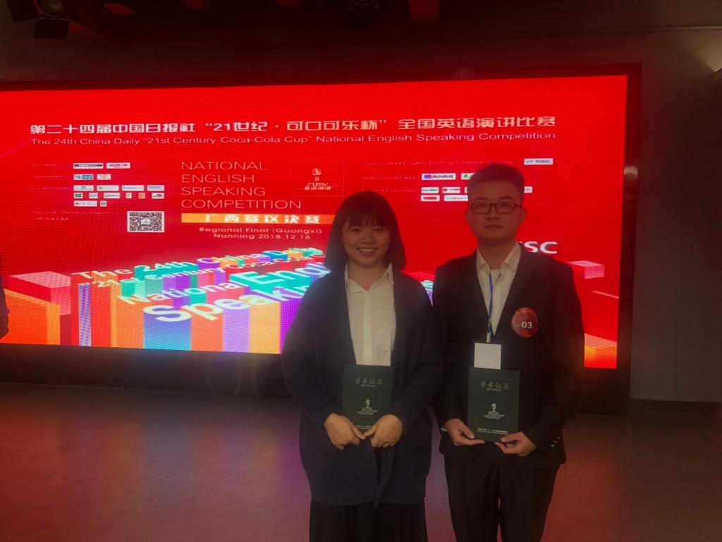 本次比赛分为三个环节。第一环节为命题演讲,主题为Reform and Opening-up:A Personal Perspective,第二环节为随机抽取题目的即席演讲,最后一个环节为现场问答。我校学子在决赛中稳定发挥,脱颖而出。外国语开元(中国)2016级英语2班的冯传振同学以流畅地道的口语、清晰的逻辑思维、新颖的演讲故事内容征服了评委,荣获广西区二等奖。材料科学与工程开元(中国)2018级材料类3班的蓝诗霞同学在大赛中以机智的应答和大方得体的台风赢得了评委的青睐,喜获广西区三等奖。