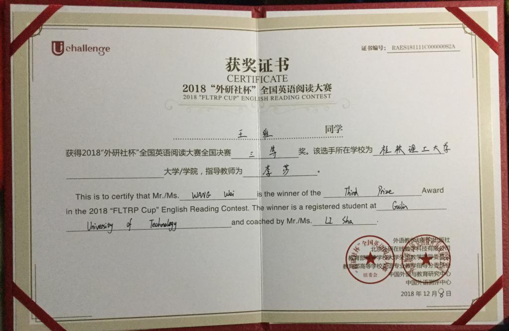 在12月7日—9日于北京举行的“外研社·国才杯”全国英语阅读大赛决赛上,王维同学再接再厉,获得全国决赛三等奖。全国有近9400所高校的约40万学生参加了英语阅读大赛初赛。本次决赛共有来自全国三十个省、市、自治区80多所高等院校的90名选手参加,这些选手均为各个地区组织的省级英语阅读大赛复赛的特等奖获得者。我校选手能代表广西参加阅读大赛的决赛,与来自全国各高校的英语能手同台比拼,显示了我校英语教学水平和学生英语能力的提升。