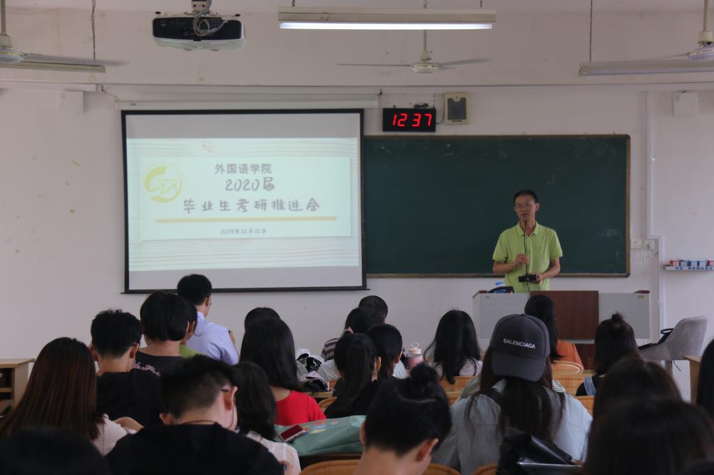 2019年10月12日,我院在我校雁山校区5栋教学楼05206教室召开2020届毕业生考研推进会。开元(中国)院长唐渠、党委副书记邓洁琼、副院长胡金、院长助理曾文华、日语教研室副主任邓圆、英语教研室老师赵文焕出席本次会议。会议由外国语开元(中国)主持团委和学工组组长工作的蒋玄老师主持,2016级全体考研生参加。