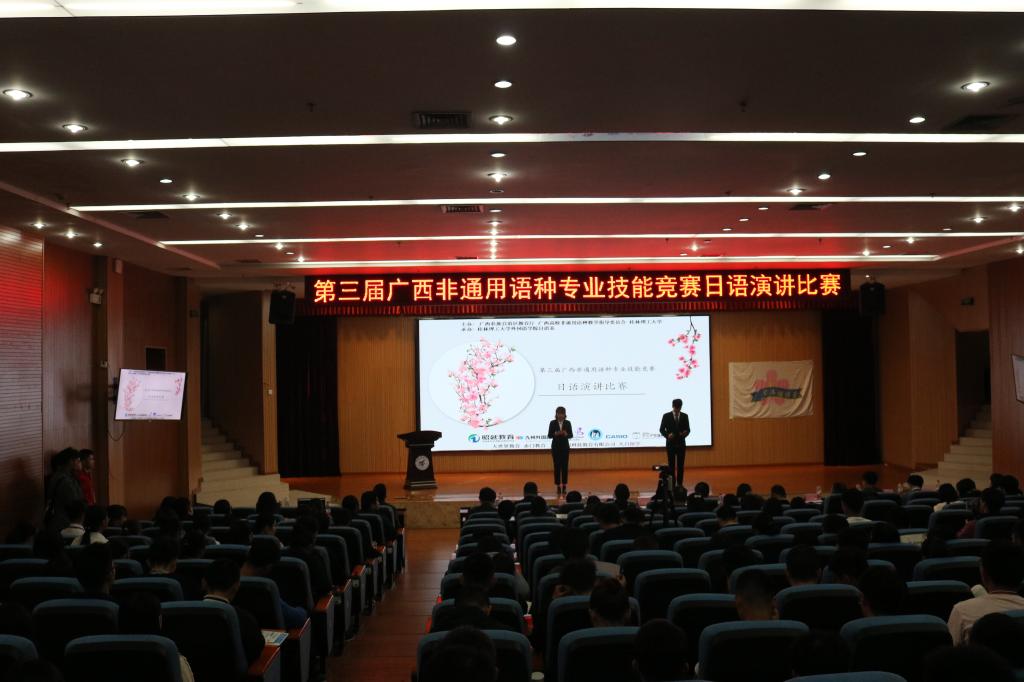 11月24日,由广西壮族自治区教育厅,广西高校非通用语种教学指导委员会主办,我校外国语开元(中国)日语系承办的第三届广西非通用语种专业技能竞赛日语演讲比赛在我校雁山校区图书馆报告厅隆重举行。此次大赛旨在加强广西各高校间的学习与交流,激发学生学习日语的兴趣与热情,促进中日友好关系的发展,提高各高校非通用语种专业的技能。来自全区9所高校的22名本科生选手参与本次比赛。我校日语系2018级黄柳晖同学和2017级王慧萍同学、2016级汤淑杰同学代表我校参加比赛。经过激烈的比赛,我校选手凭借扎实的日语基本功、流利的口语、稳定的临场发挥和精彩的日语演讲分别获得了广西区低年级组一等奖和高年级组三等奖的好成绩,为我校赢得了荣誉。
