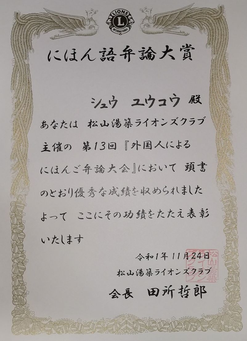同日,我校在日本爱媛大学交换学习的2017级周有恒、玉国立两位同学在日本四国爱媛县举行的“第13届外国人日语辩论大赛(市级)”中分别获得了一等奖和二等奖。本月3日,周有恒同学还在由爱媛县留学生交流推进会举办的“第16届留学生日语演讲比赛(省级)”中荣获一等奖。这是我院日语专业学生在海外演讲比赛中首获一等奖、二等奖荣誉,对促进中日交流以及宣传我校起到了积极地作用。