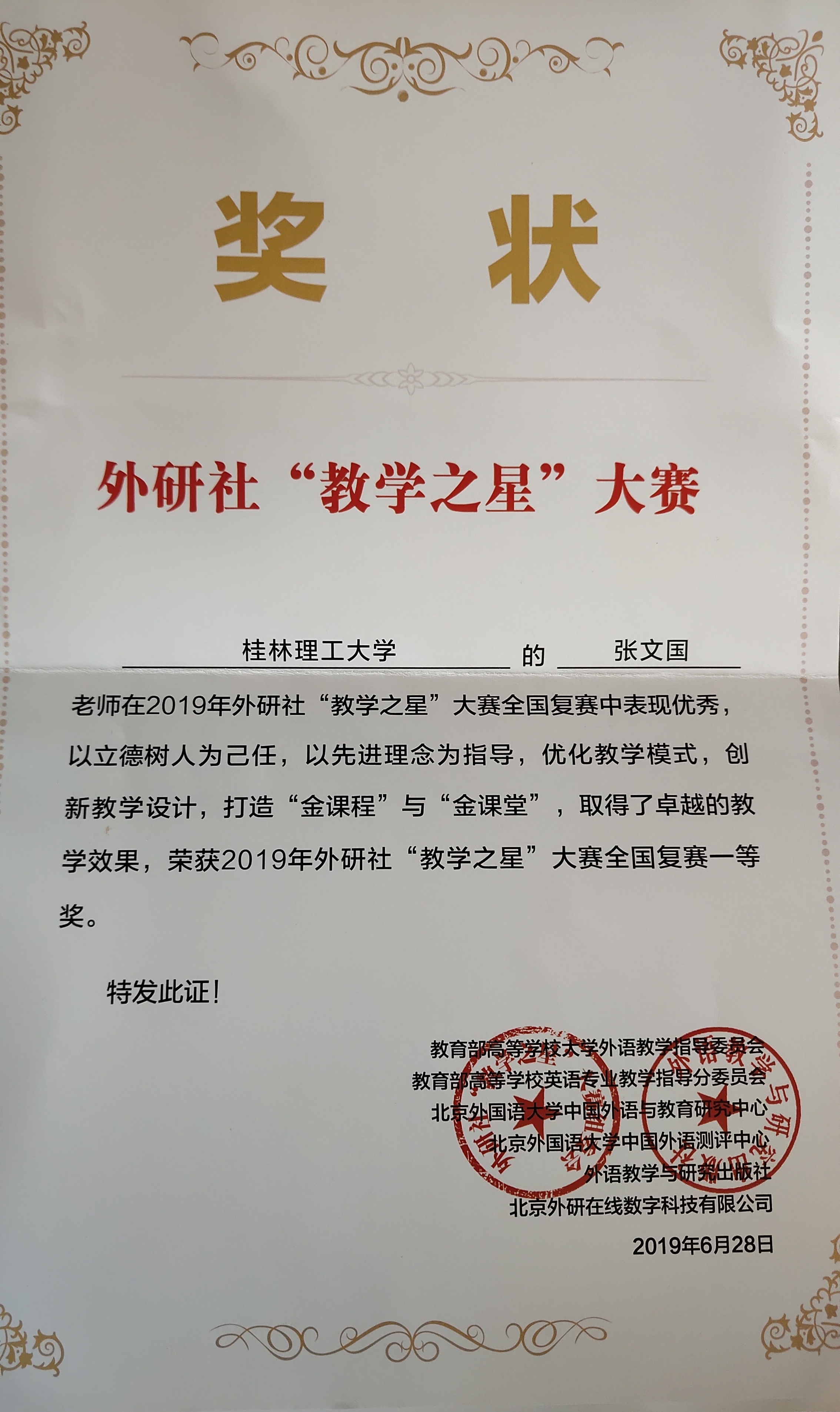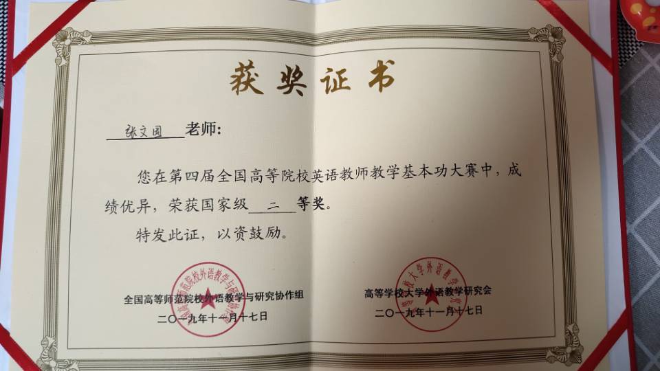 张文国老师教学基本功大赛全国二等奖证书
