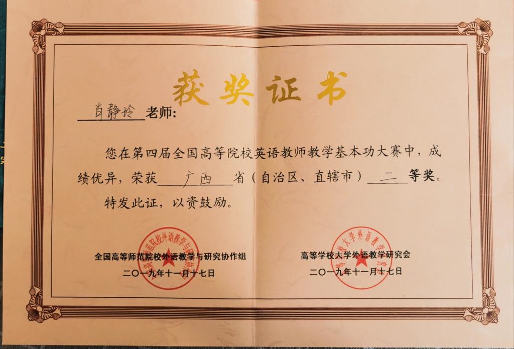 肖静玲老师教学基本功大赛二等奖证书
