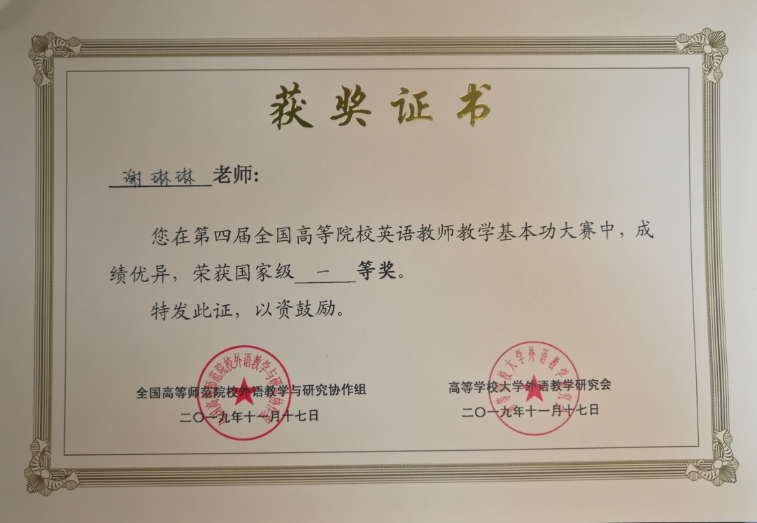 谢琳琳老师教学基本功大赛全国一等奖证书