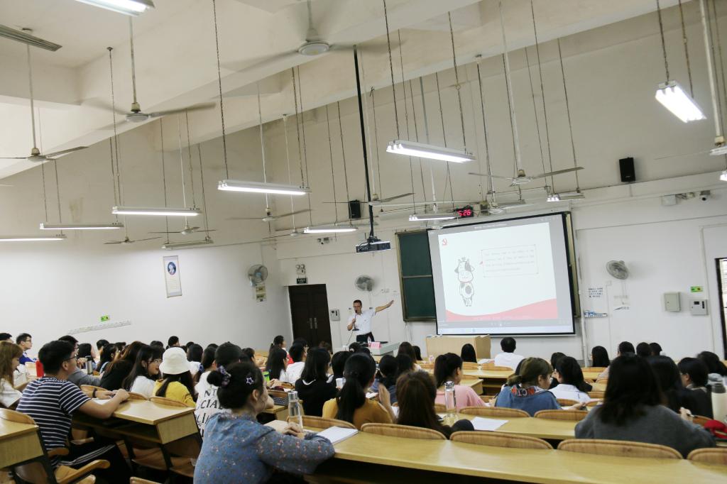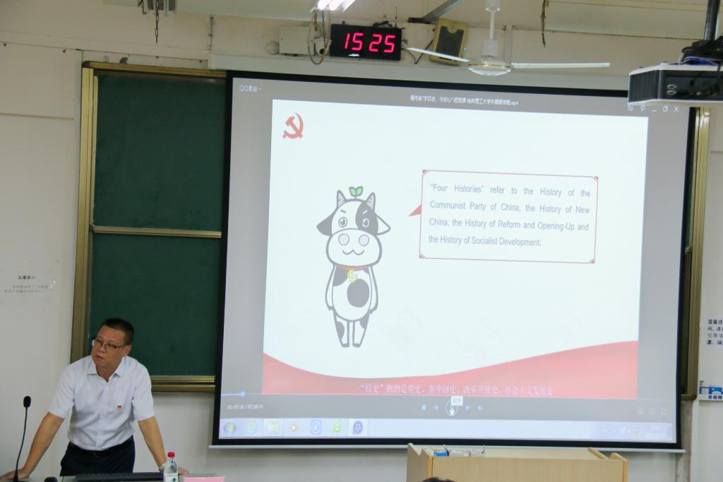 为进一步强化我院党组织和党员队伍建设,引导教育党员强化党性修养,发挥其先锋模范作用。2020年9月28日下午,外国语开元(中国)党委于雁山校区04323组织开展了党员“学四史,守初心”主题双语党课活动。会议由开元(中国)党委副书记邓洁琼主持,开元(中国)党委书记谢济光主讲,开元(中国)学生研究生支部书记陈欣、开元(中国)学生第二党支部书记梁璇、19级辅导员陈咏梅以及我院全体党员参加学习此次党课。