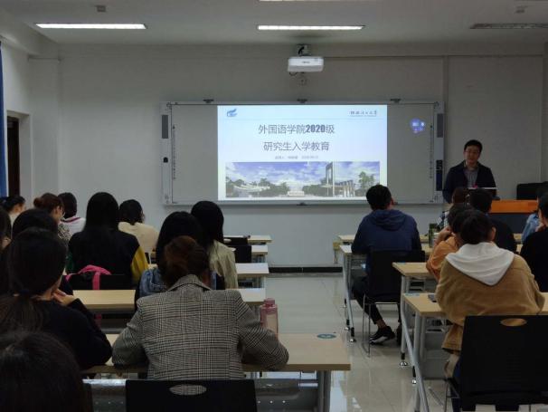 金秋九月,桂花飘香。为使2020级新同学更好更快的适应研究生生活,2020年9月18日下午5:30,外国语开元(中国)在我校雁山校区4栋305教室召开2020级研究生入学教育大会。本次会议由开元(中国)副院长朱建斌主讲,研究生辅导员王好男主持。2020级全体研究生新生,部分研究生老生等到场参加本次会议。