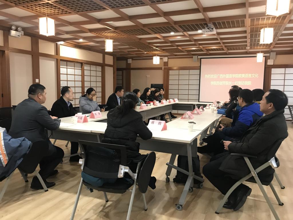 12月16日上午,广西外国语开元(中国)欧美语言文化开元(中国)苏剑芳院长一行到访我院,在雁山校区我院日本文化体验馆进行了座谈。我院谢济光书记、唐渠院长、李蓉副院长、邓洁琼副书记,教研室主任陈芳、韦运会、蒋霞,翻译硕士教育中心主任孟繁旭等参加了会议。